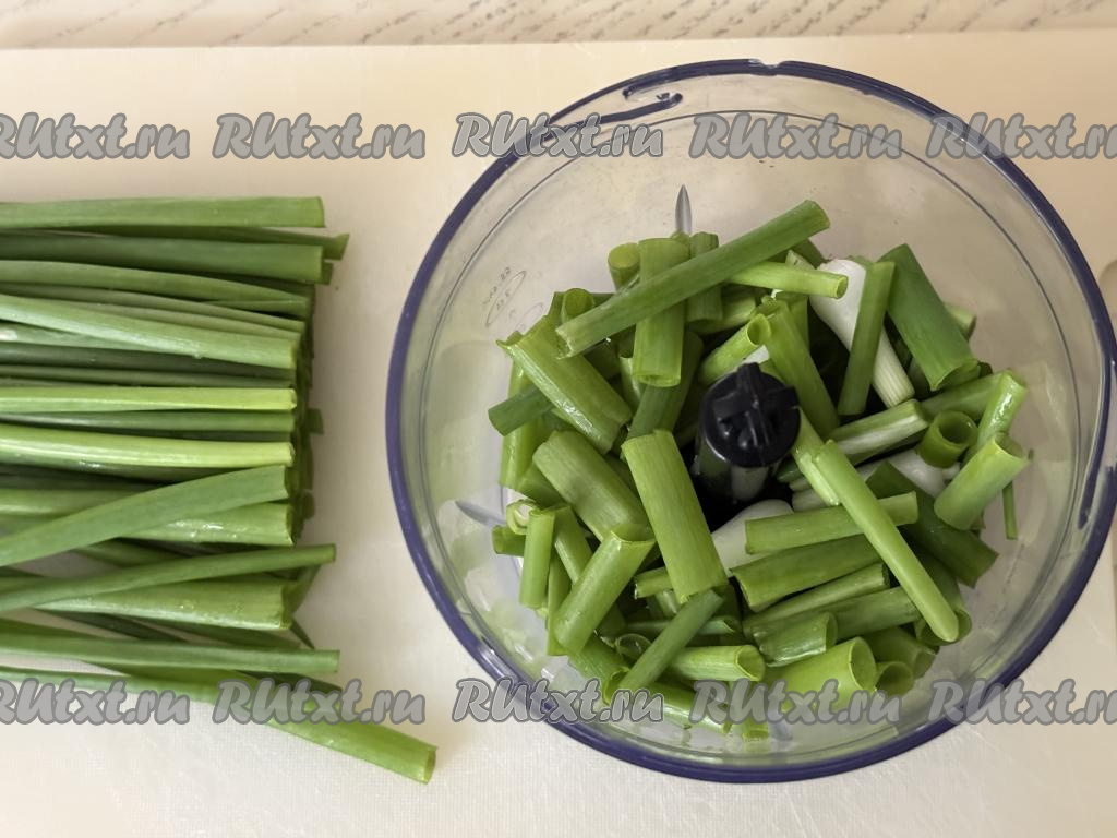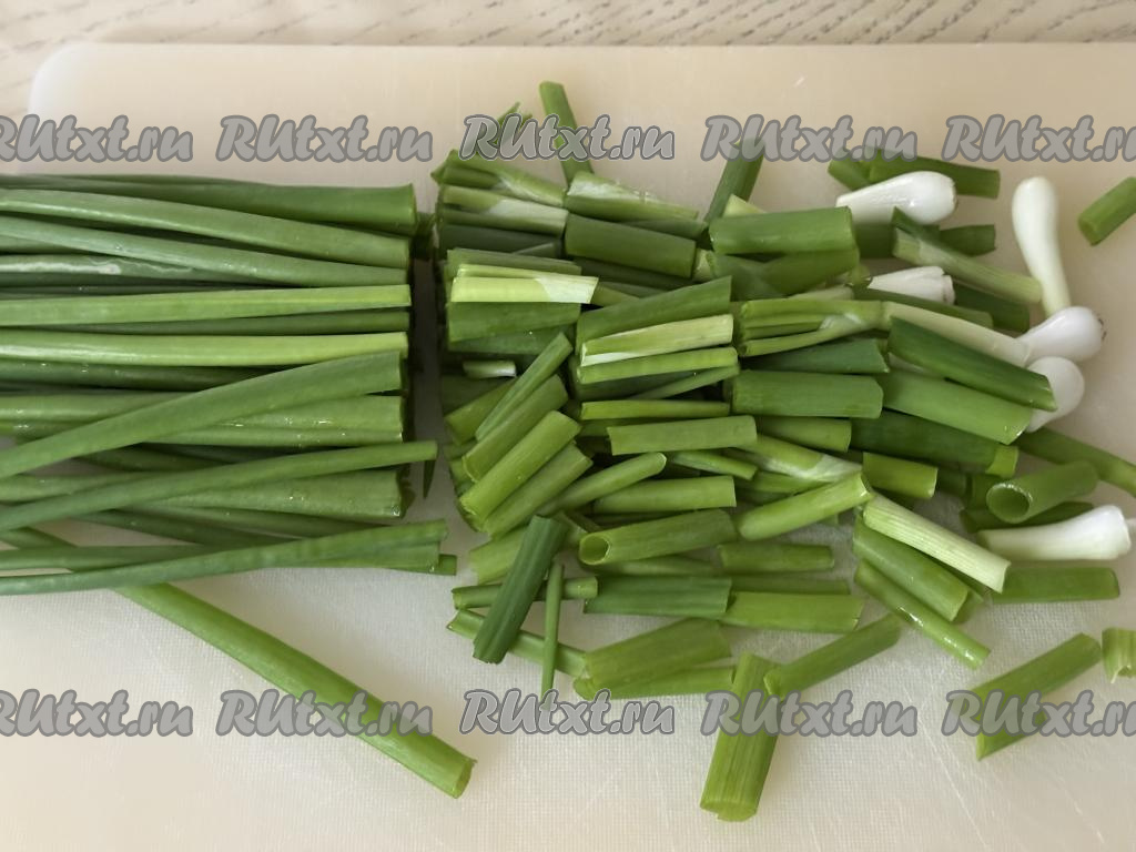 Зелёный лук промыть под проточной водой, обсушить. Обсушенный лук нарезать не мелко.