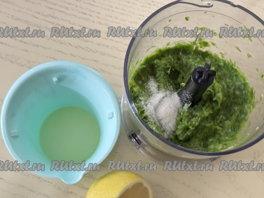 Пробить лук в измельчителе до состояния пюре. Затем ещё добавить партию лука в чашу и ещё раз пробить в измельчителе. Таким образом измельчить всю луковую массу. Добавить в чашу соль и свежевыжатый лимонный сок.