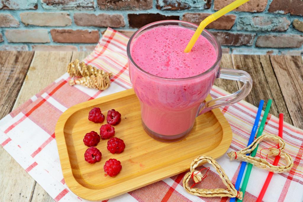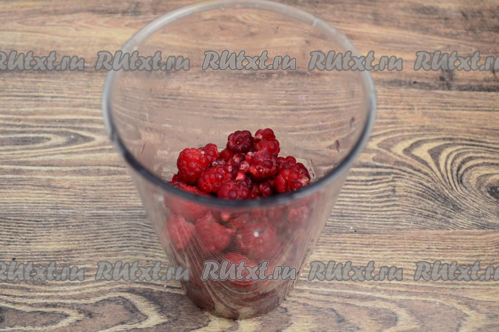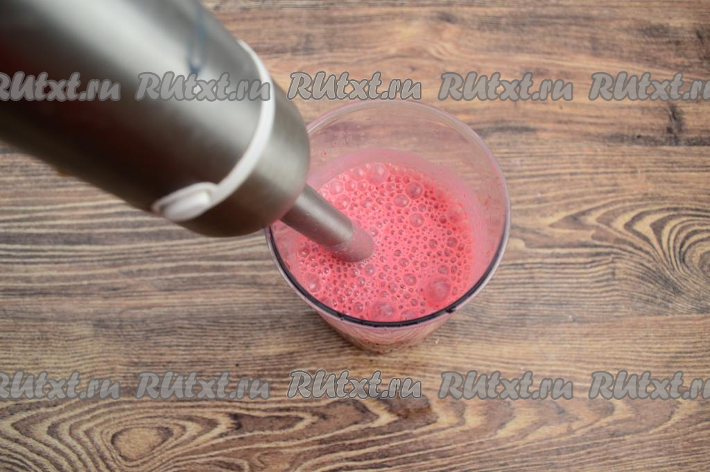 Пробить малиново-молочный напиток блендером до образования характерных пузырьков на поверхности смузи.