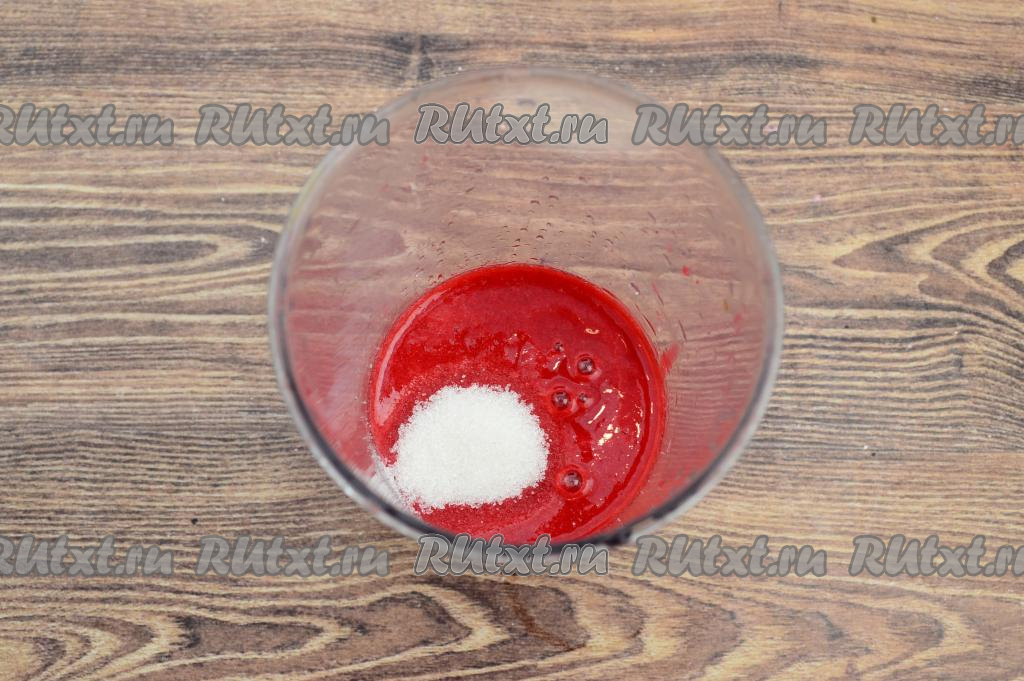 Процеженное малиновое пюре снова перелить в чашу погружного блендера. Всыпать сахар по вкусу.
