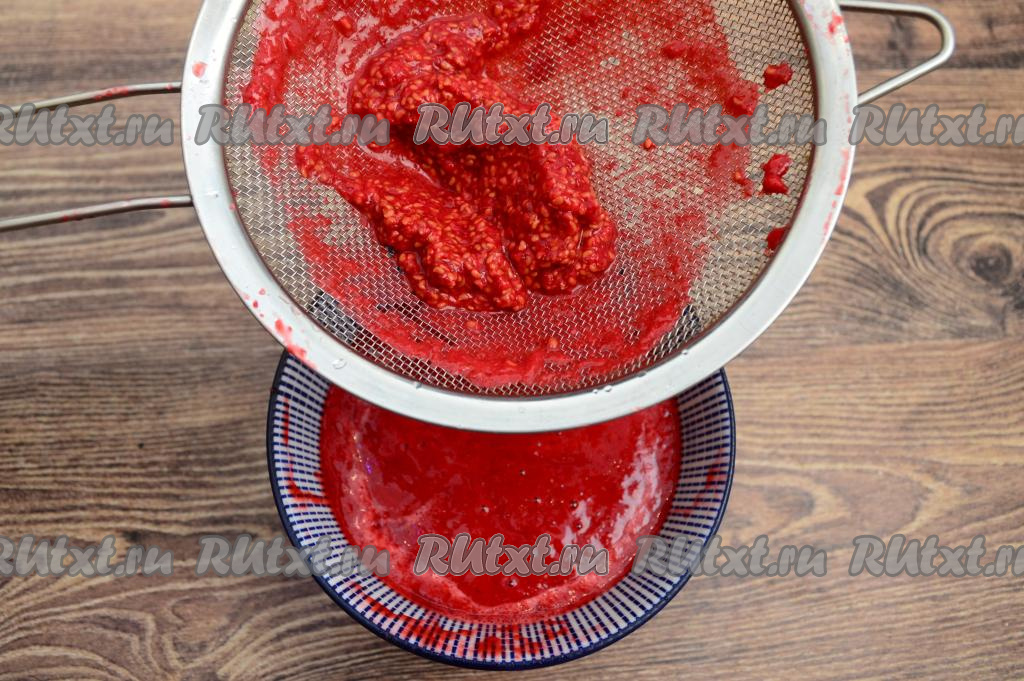 Для того чтобы избавиться от косточек, перетереть малиновое пюре через сито с помощью столовой ложки в глубокую тарелку - это простое и быстрое действие сделает готовый смузи однородным и более нежным на вкус. В сите останется практически сухой жмых с косточками малины, он нам не понадобится (я его выбрасываю). А в тарелке у нас будет в меру густое процеженное малиновое пюре.