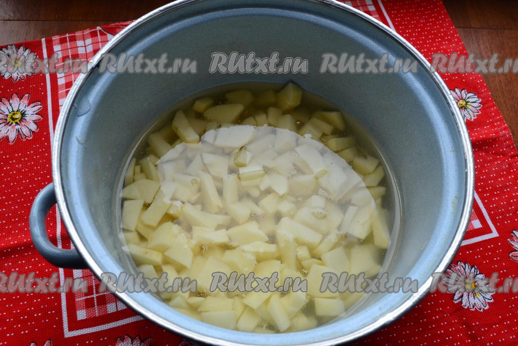 Картофель очистить, нарезать на средние кусочки, выложить в кастрюлю, влить 3 литра воды, поставить на огонь.