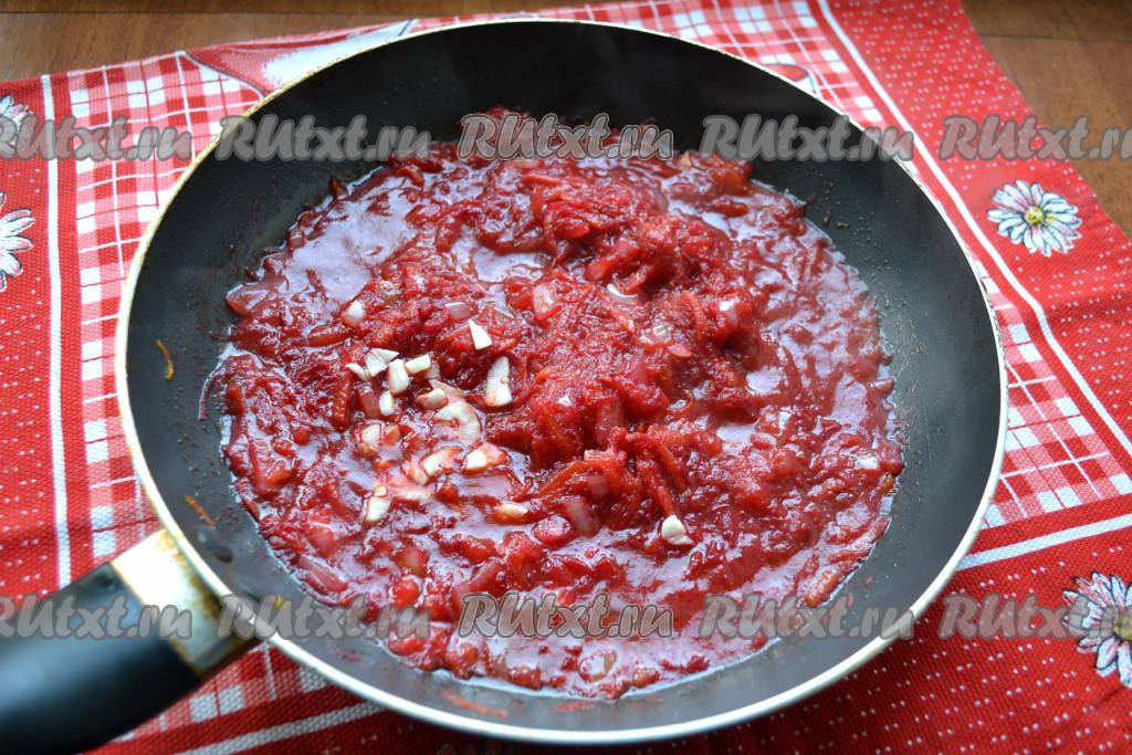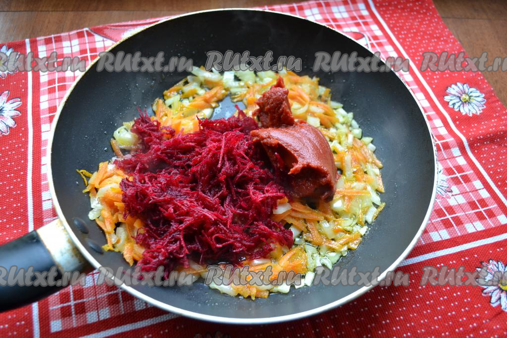 Обжарить морковку с луком в течение 5-7 минут (до мягкости моркови), иногда помешивая, на среднем огне. Затем выложить в сковороду натёртую на мелкой тёрке свеклу, добавить томатную пасту.