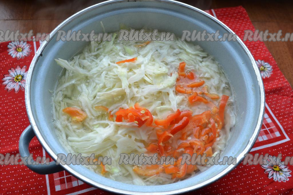 После закипания воды добавить капусту, нарезанную на тонкие полоски, посолить, довести до кипения, уменьшить огонь, варить 20 минут. Болгарский перец, если будете добавлять, нужно очистить от семян и плодоножки, нарезать на полоски. После того как капуста с картошкой проварятся 20 минут (овощи должны стать достаточно мягкими), добавить в кастрюлю болгарский перец, довести до кипения, уменьшить огонь, варить на небольшом огне 5-7 минут. Если не будете добавлять перец, тогда просто продолжайте варить картошку с капустой ещё 5 минут.