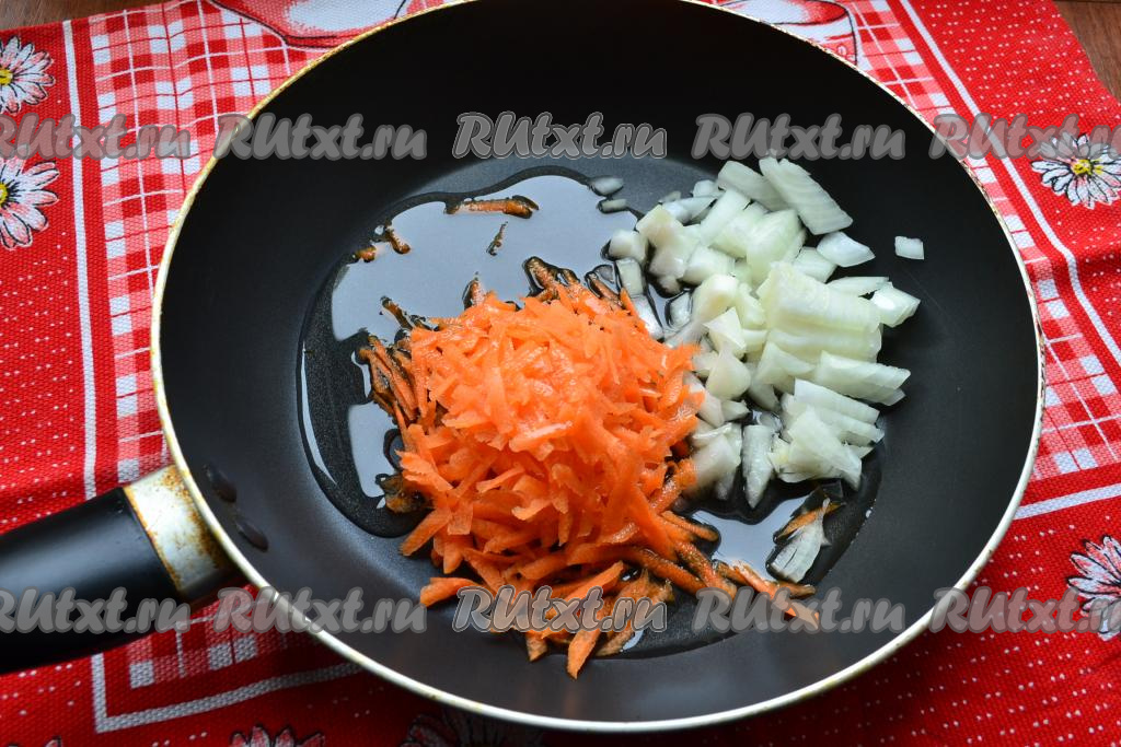 Пока варятся картошка с капустой, нужно заняться зажаркой для борща. Для этого нужно очистить лук, чеснок и морковь. Лук мелко нарезать, морковь натереть на крупной тёрке. Выложить лук с морковью в сковороду с растительным маслом.
