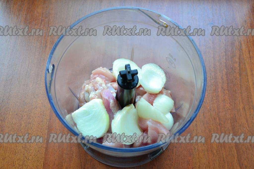 Куриное мясо нарезать на кусочки, поместить вместе с очищенным и нарезанным луком в чашу блендера.