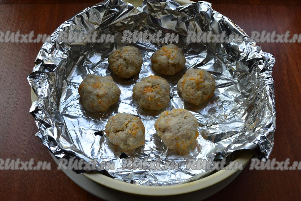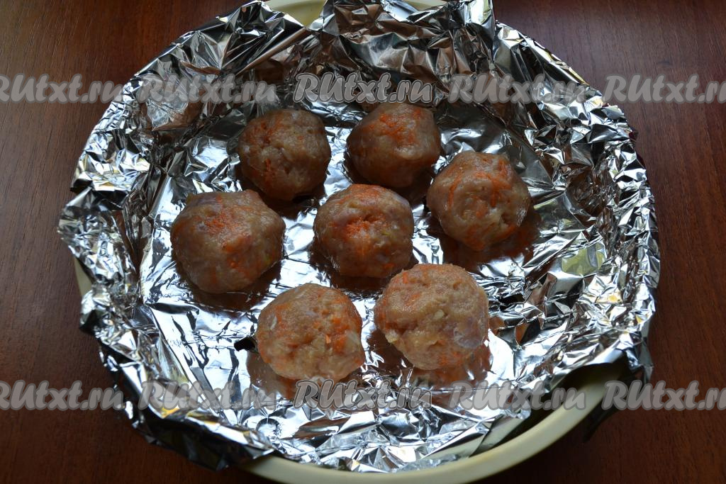 Мокрыми руками сформировать небольшие тефтели, выложить их в чашу для варки на пару (если готовите в мультиварке) или поместить в пароварку, или в миску, которую поставить на кастрюлю с водой (для готовки на газу). Чашу мультиварки можно застелить фольгой и сделать дырочки (это можно сделать для того, чтобы вам было легче ее вымыть).