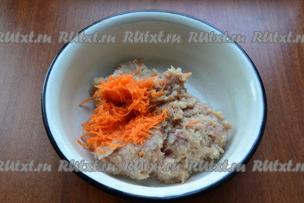 Очищенную морковь натереть на средней или мелкой терке, добавить к фаршу, хорошо перемешать и отбить фарш о дно миски.