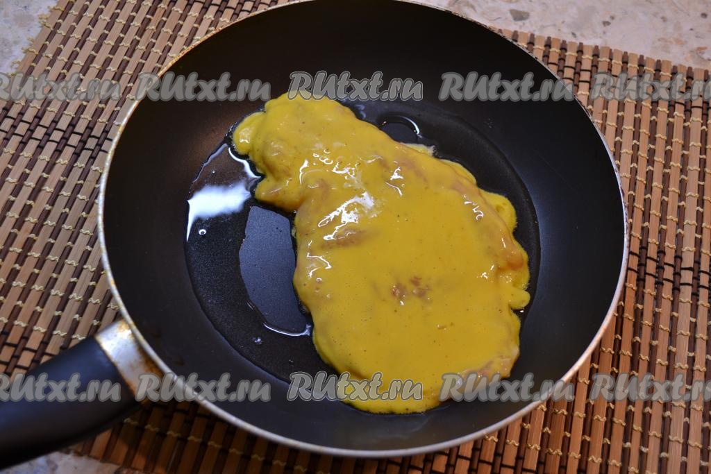 Растительное масло хорошо разогреть в сковороде. Отбивную из куриного филе, покрытую яичным кляром, выложить на сковороду.