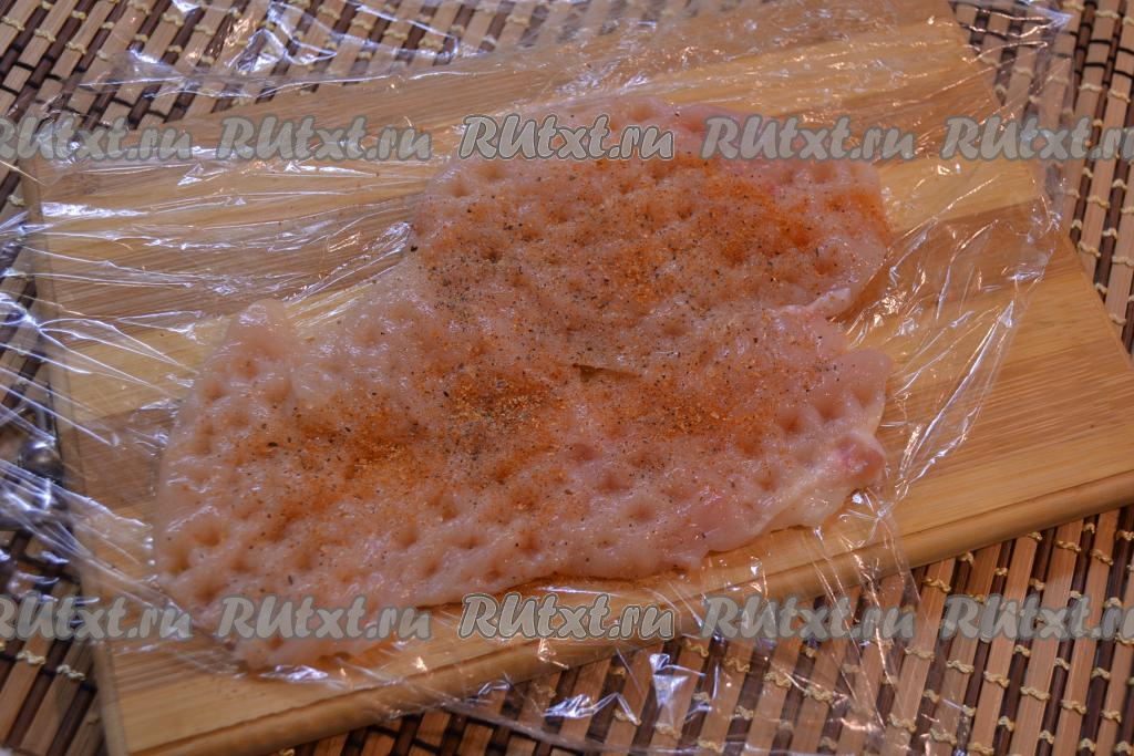 Куриное филе промыть водой, обсушить, затем разрезать вдоль на 2 более тонкие части (в результате у нас получатся 2 отбивные). Накрыть филе пищевой плёнкой и отбить молоточком. Посолить каждую отбивную и посыпать любимыми специями.