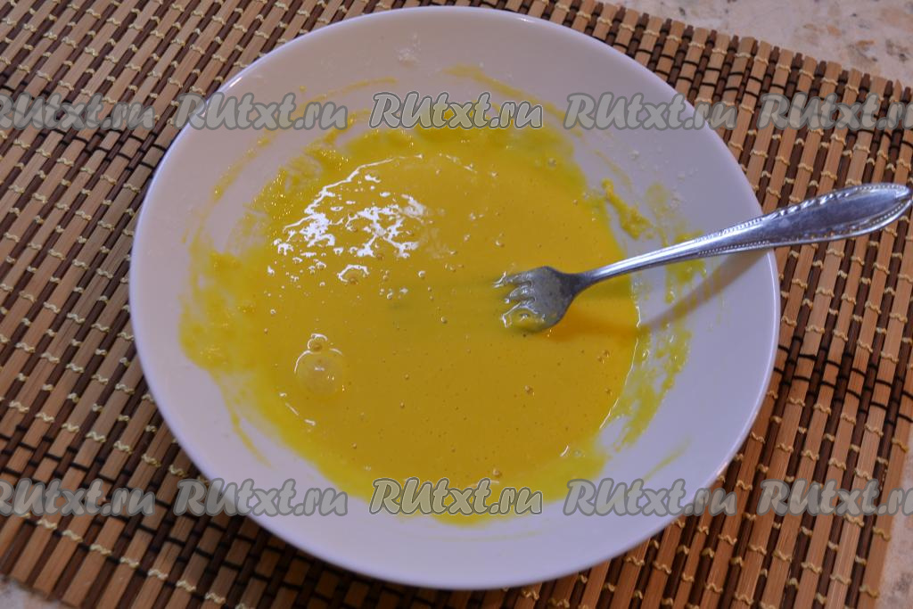 Яйцо тщательно взбить вилкой, затем добавлять по половине столовой ложки муки, тщательно вмешивая её вилкой в яичную массу.