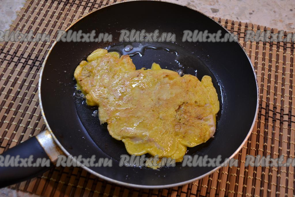 Куриную отбивную обмакнуть со всех сторон в подготовленный яичный кляр. Обмакивайте в кляр столько отбивных, сколько поместится на сковороду за один раз. У меня небольшая сковорода, поэтому я жарила по одной отбивной, а соответственно вначале покрыла кляром одну отбивную.