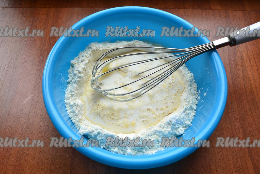 Молоко смешать с водой и вливать в муку частями, перемешивая все венчиком.