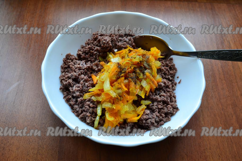 Сердце перекрутить через мясорубку, посолить и поперчить, добавить обжаренные овощи, перемешать и начинка для блинчиков готова.