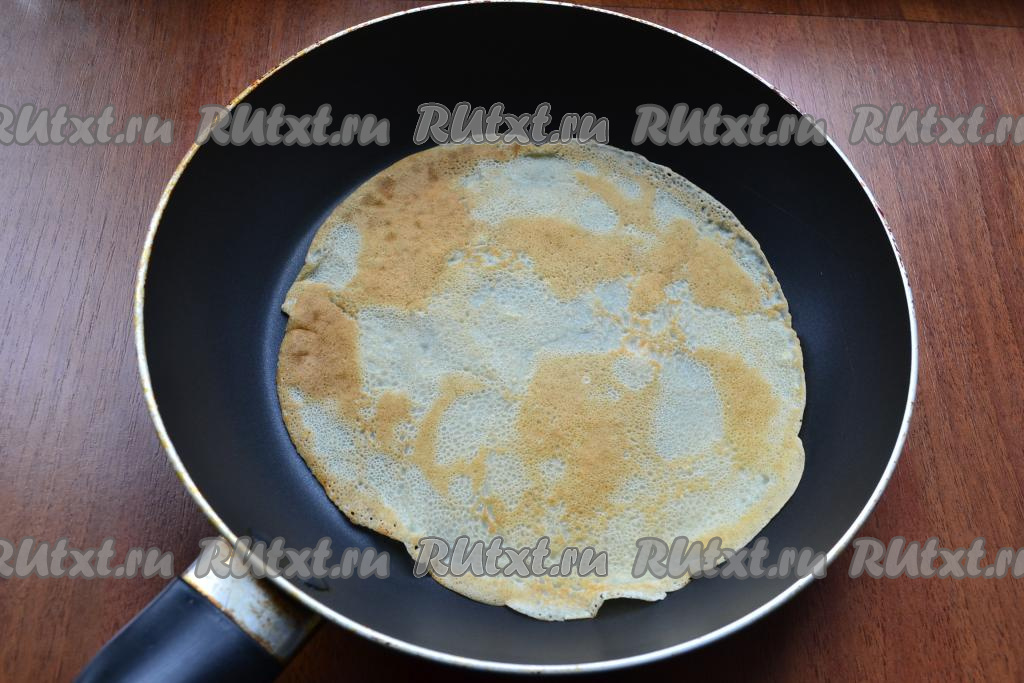 Разогреть сковороду, перед выпечкой первого блина влить немного растительного масла, разогреть масло. Затем налить тесто, равномерно распределяя его по поверхности сковороды, и жарить блинчик на среднем огне до румяности с двух сторон. Последующие блины жарить на сухой сковороде.