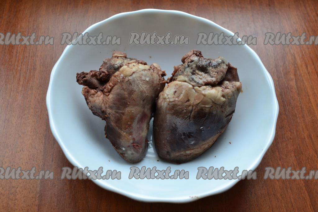 Свиное или говяжье сердце хорошо вымыть, залить водой и оставить в воде на пару часов. Затем полностью залить сердце чистой водой, поставить на огонь, после закипания уменьшить огонь и варить в подсоленной воде до готовности (говяжье сердце варится 2-3 часа, а свиное сердце - 1,5-2 часа). Сердце остудить.