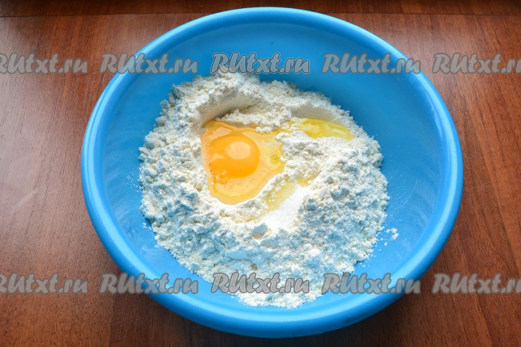 Для приготовления теста для блинов в миску насыпать муку, добавить сырое яйцо, соду, соль и сахар.