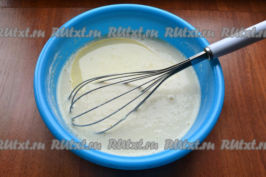 Затем влить растительное масло, венчиком замесить и немного взбить тесто. Блинное тесто получится не слишком густым, но и не жидким.