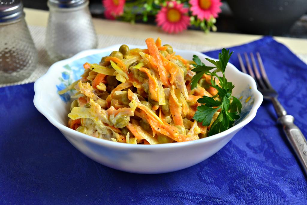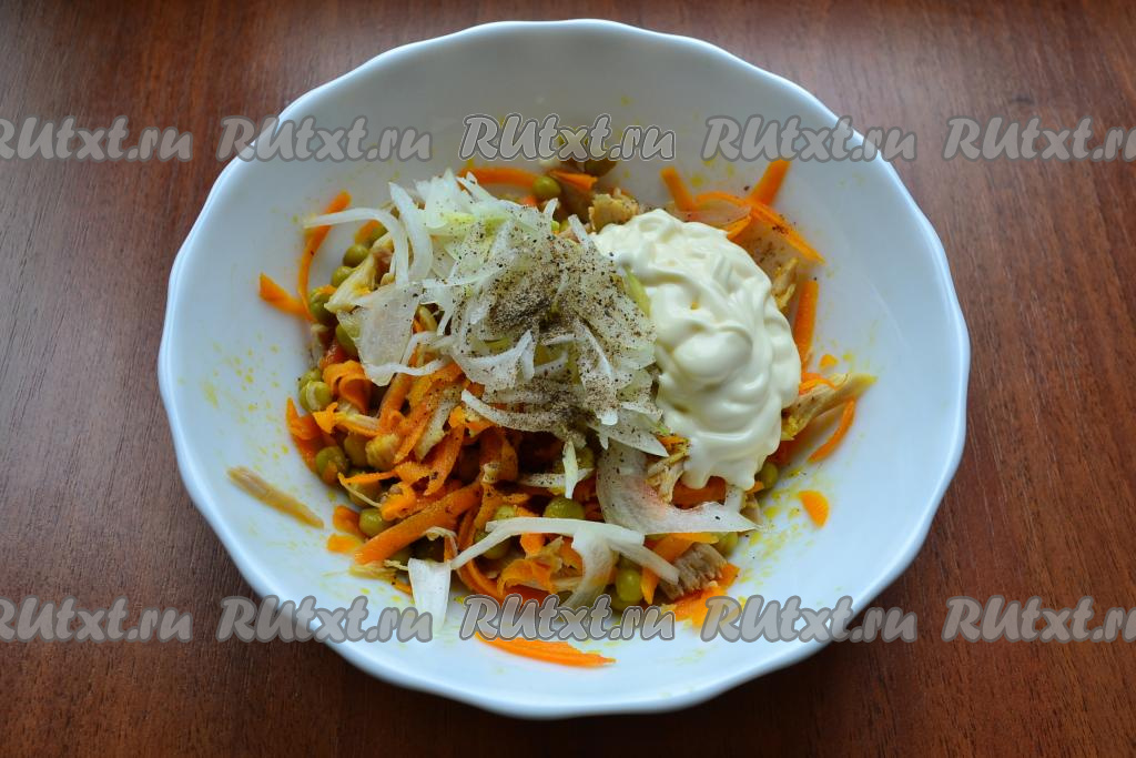 Замариновавшийся лук отжать от маринада и выложить в салат из обжаренной моркови, курицы и горошка, добавить майонез, соль и чёрный молотый перец.