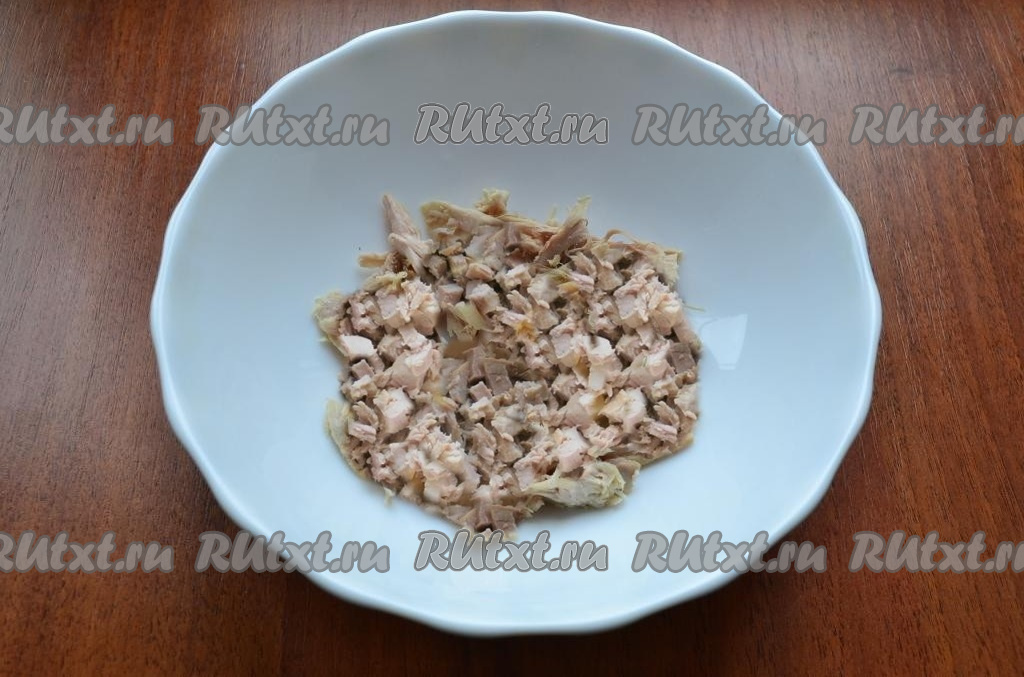 Варёную свинину нарезать достаточно мелко, выложить в миску.