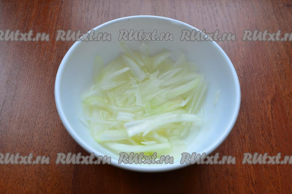 Мякоть свинины вымыть, выложить в кастрюлю, залить полностью водой, поставить на огонь. После закипания воды добавить соль, уменьшить огонь, варить свинину минут 40-45. Затем выложить варёную свинину на тарелку, дать остыть. Репчатый лук очистить, нарезать на тонкие полукольца (или четверть кольца), выложить в небольшую достаточно глубокую тарелку, влить уксус, 50 миллилитров кипящей воды, добавить сахар, перемешать и оставить мариноваться минут на 20.