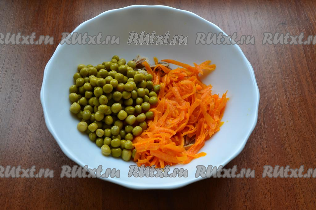 Очищенную морковь, натерев на крупной тёрке, выложить на сковороду, в которой уже прогрелось растительное масло, и обжарить на среднем огне, помешивая, в течение 5 минут (морковка должна стать достаточно мягкой). Обжаренную морковь немного остудить и вместе с консервированным горошком (без жидкости) добавить в миску со свининой.