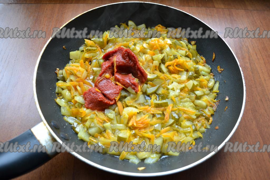 Перемешать овощи и обжарить их, иногда помешивая, до мягкости моркови (ориентировочно на жарку потребуется минут 5-6). Затем добавить солёные огурцы, обжаривать овощи вместе минут 5-7, периодически перемешивая. Добавить томатную пасту, влить огуречный рассол.
