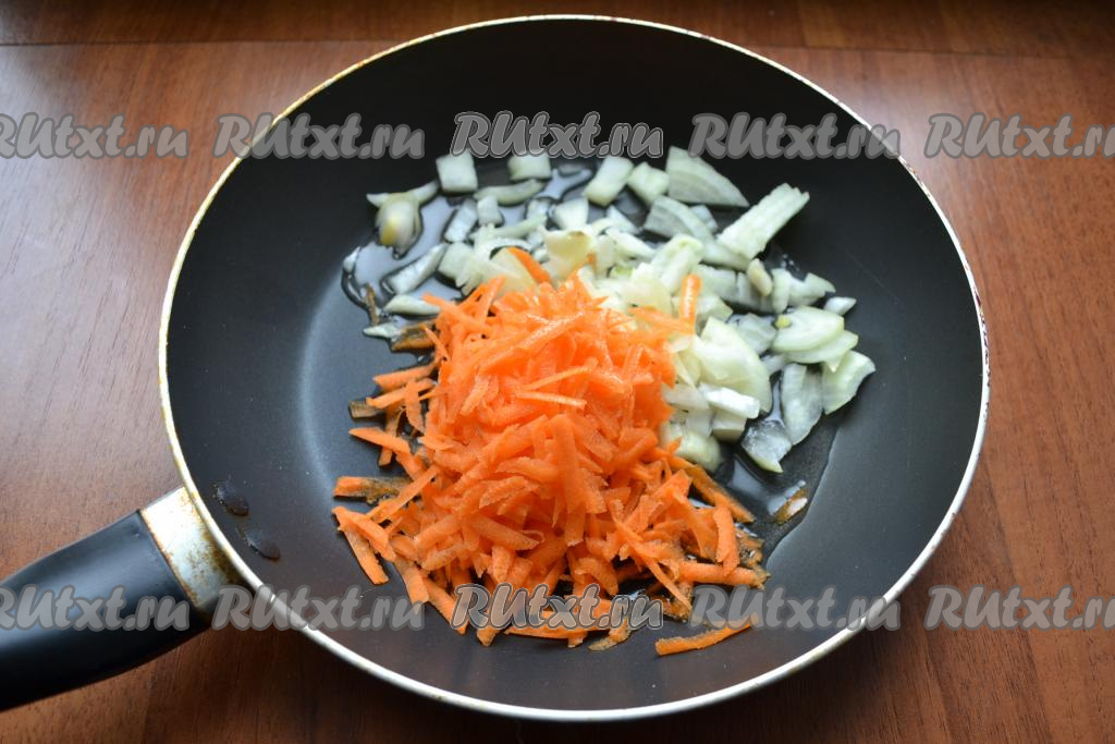 Пока варятся картошка с рисом, займёмся обжариванием овощей. Для этого нужно очистить лук и морковку. В сковороде прогреть растительное масло, выложить морковь, натёртую на крупной тёрке, добавить мелко нарезанный лук.