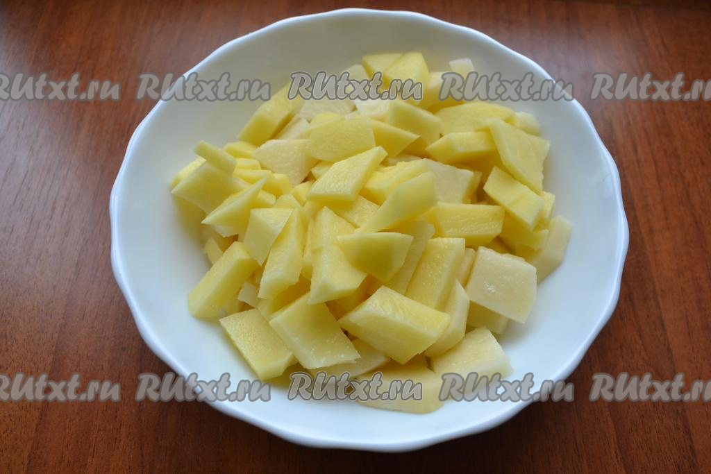 Картофель очистить, нарезать на небольшие кубики (или кусочки). Рис промыть водой, лишней воде дать стечь.