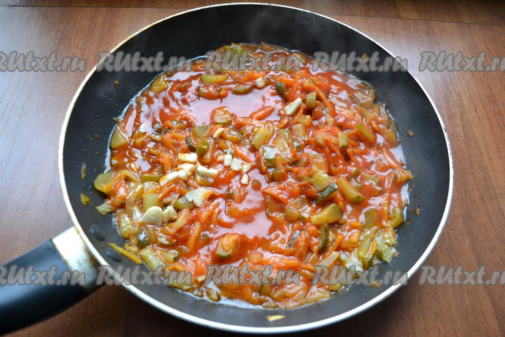 Перемешать содержимое сковороды, подсолить по вкусу, добавить сахар, довести до кипения, уменьшить огонь, протушить заправку минут 5, далее добавить измельчённый чеснок. Заправку перемешать и снять с огня.