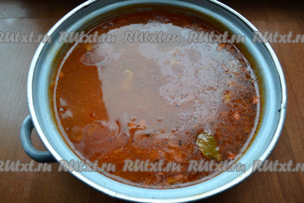 После того как картошка с рисом и свининой с момента закипания проварятся 20-25 минут (и картофель, и рис, должны стать достаточно мягкими), выложить в кастрюлю заправку со сковороды, добавить специи и лавровый лист. Дать рассольнику закипеть, подсолить по вкусу, уменьшить огонь, проварить 5-7 минут.