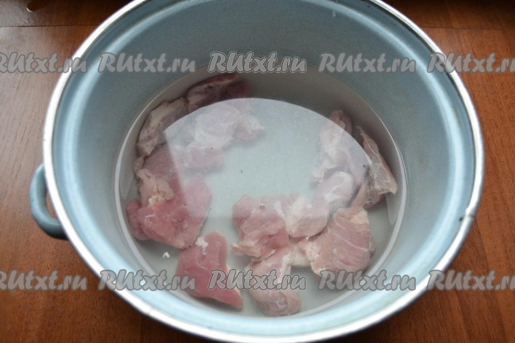 Свинину (можно взять как мякоть, так и, например, рёбрышки на кости) нужно вымыть и, нарезав на порционные кусочки, поместить в кастрюлю, залить 3 литрами воды, поставить на огонь. После закипания воды снять пену, уменьшить огонь, варить мясо 30 минут.