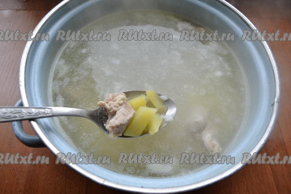 По истечении 30 минут с момента закипания бульона к отваренному мясу добавить картофель и рис, дать закипеть, перемешать, уменьшить огонь, варить минут 20-25 (картошка и рис должны стать мягкими).