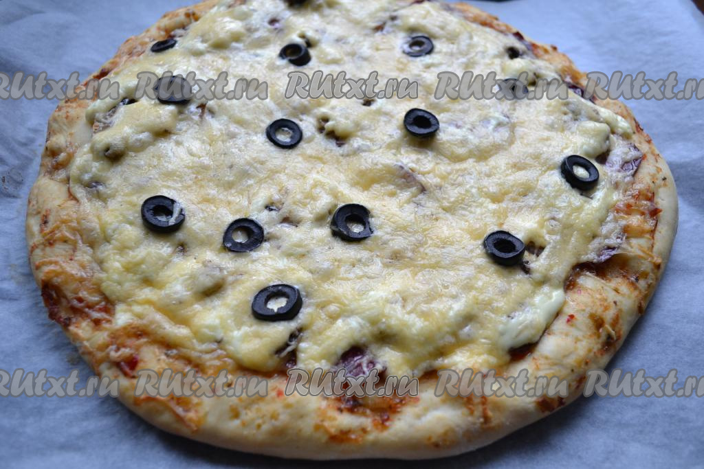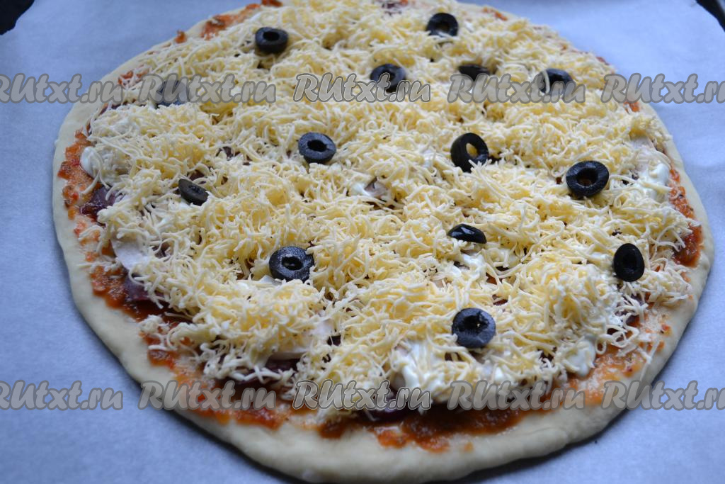 Пиццу выпекать в разогретой до 220-230 градусов духовке около 15 минут.