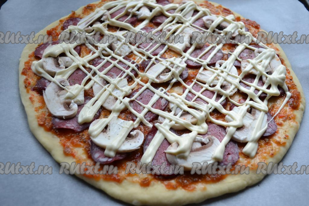 Поверх колбасы и грибов нанести сеточку из майонеза.