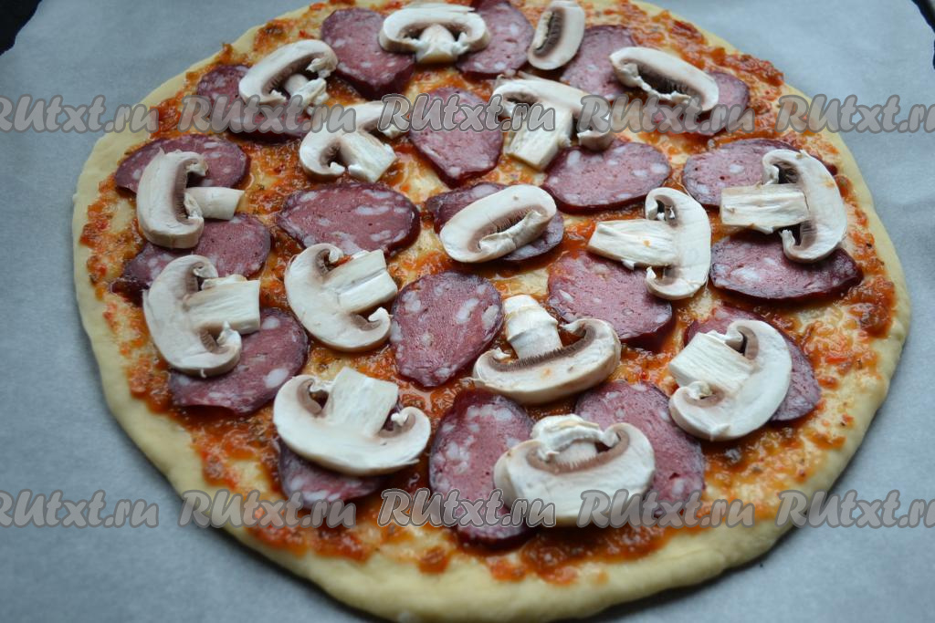 Колбасу нарезать тонкими ломтиками, шампиньоны - пластинами. Разместить колбасу с шампиньонами по всей лепешке.