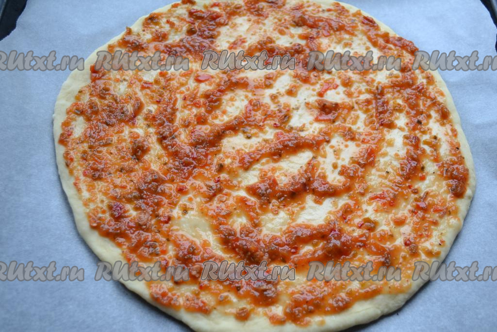 Тесто обмять, на столе, присыпанном мукой, раскатать в пласт толщиной около 1 см. Выложить тесто на противень, застеленный бумагой для выпечки. Смазать тесто томатным соусом.
