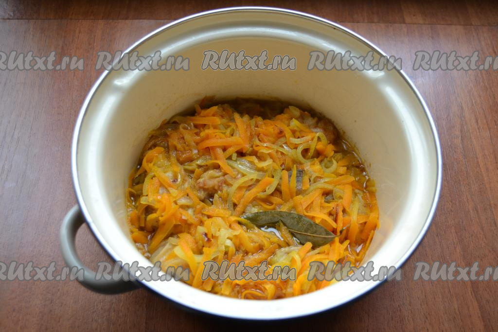 Морковку и репчатый лук очистить. В сковороде прогреть растительное масло, выложить лук, нарезанный на полукольца. Обжарить лук до прозрачности (в течение 4-5 минут), иногда помешивая, на среднем огне. К обжаренному луку добавить морковку, натёртую на крупной тёрке, перемешать. Обжаривать овощи, иногда помешивая, до мягкости (примерно в течение 5-6 минут).