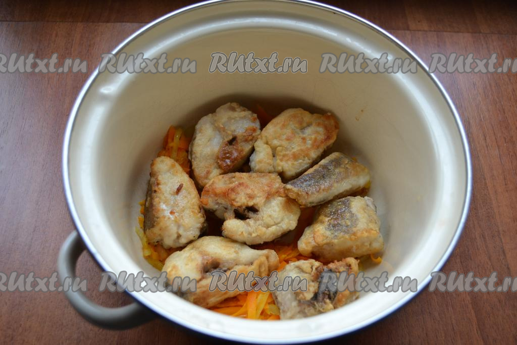 Кусочки хека обвалять в муке со всех сторон, затем выложить на отдельную сковороду, уже разогретую с растительным маслом. Обжарить кусочки хека на среднем огне до румяности с двух сторон. Далее половину обжаренных овощей выложить на дно кастрюли с толстым дном, на овощи разложить обжаренные кусочки хека.