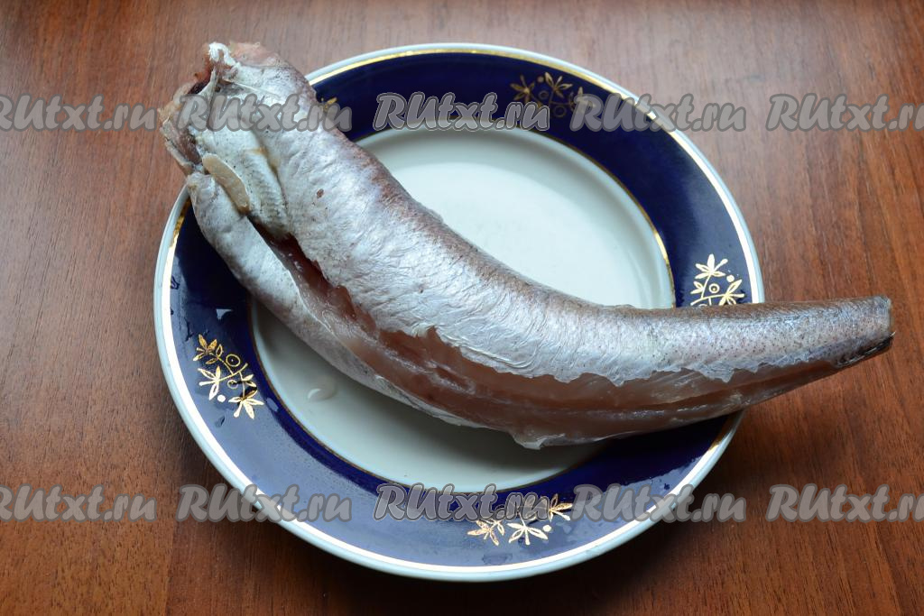 Тушку хека разморозить, удалить внутренности вместе с чёрной плёночкой, отрезать плавники, хорошо промыть рыбу водой и обсушить.