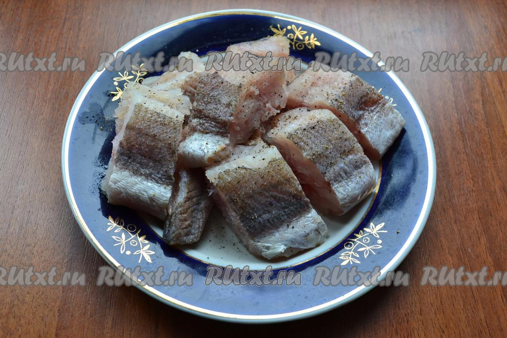 Нарезать рыбу на кусочки шириной около 2 сантиметров, посолить их и поперчить.