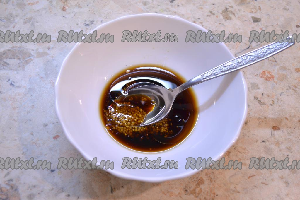 Для приготовления маринада нужно в глубокой тарелке соединить соевый соус, растительное масло и горчицу (у меня - зернистая (французская) горчица, можно использовать обычную), перемешать.