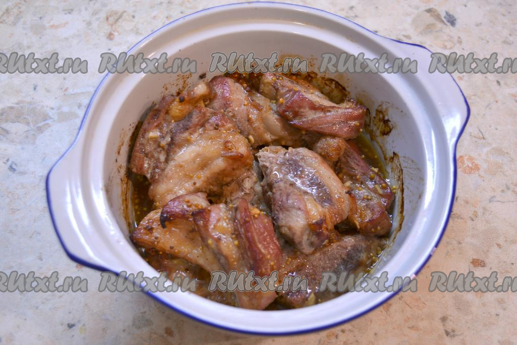 Поместить форму с рёбрышками в холодную духовку, включить духовку и выставить температуру 180 градусов. Запекать свиные рёбра в соевом соусе с мёдом и горчицей 1 час 15 минут.
