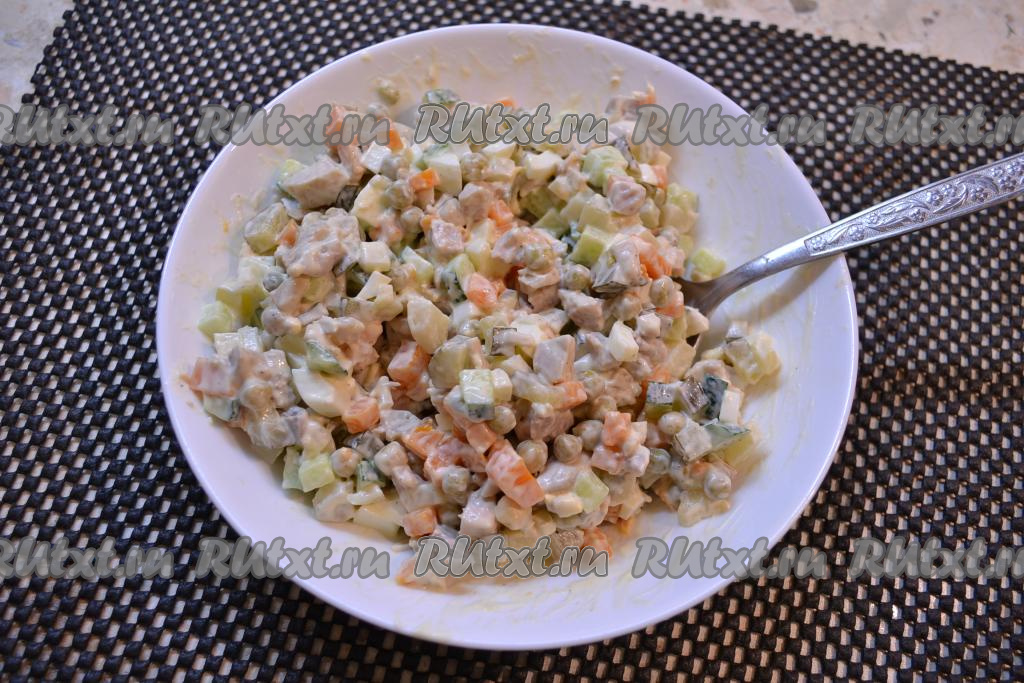 Очень вкусный, насыщенный салат "Столичный", приготовленный с курицей и свежим огурцом по классическому рецепту, выложить в салатник, украсить и подать к праздничному столу.