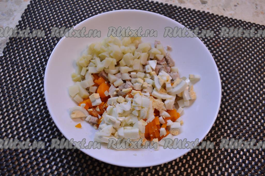 Картошку и яйца очистить, нарезать на кубики примерно такого же размера, как нарезаны морковка и курица. Нарезанные яйца и картофель выложить в миску с куриным мясом и морковью.