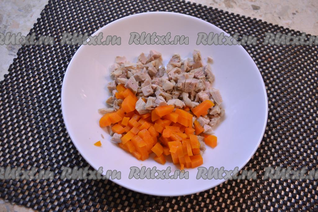 Прежде всего нужно вымыть морковь и картофель, не очищая от кожуры, выложить в кастрюлю, залить полностью водой и поставить на огонь. С момента закипания, уменьшив огонь, отварить овощи до готовности (на отваривание моркови потребуется минут 30-35, картофеля - минут 25, готовые овощи будут легко прокалываться вилкой). Куриное филе отварить в подсоленной воде в течение 25-30 минут с момента закипания воды. Яйца отварить в течение 10 минут после закипания воды. Варёные яйца, морковку, картошку и мясо курицы выложить на тарелку, дать полностью остыть. Варёную морковку очистить. Куриное мясо и морковь нарезать на небольшие кубики примерно одинакового размера, выложить в глубокую миску.