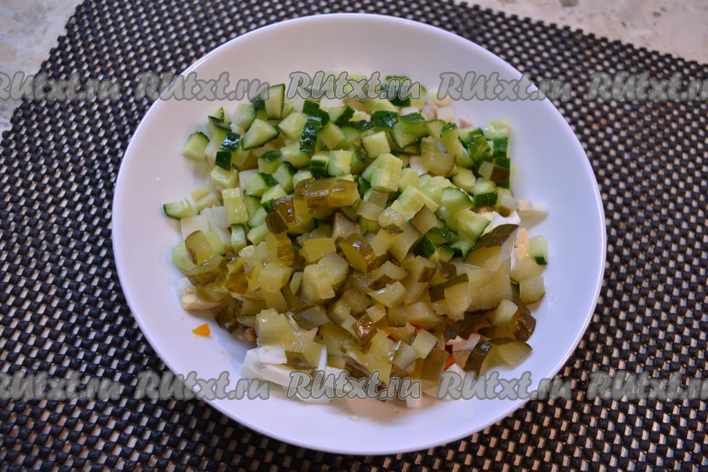 Свежий огурец вымыть, отрезать кончики с двух сторон. Салат "Столичный" можно приготовить только со свежими огурцами, но особенно вкусным он получается если добавить и свежий, и маринованный огурчики. Маринованный и свежий огурцы тоже нарезать на небольшие кубики, добавить в салат.