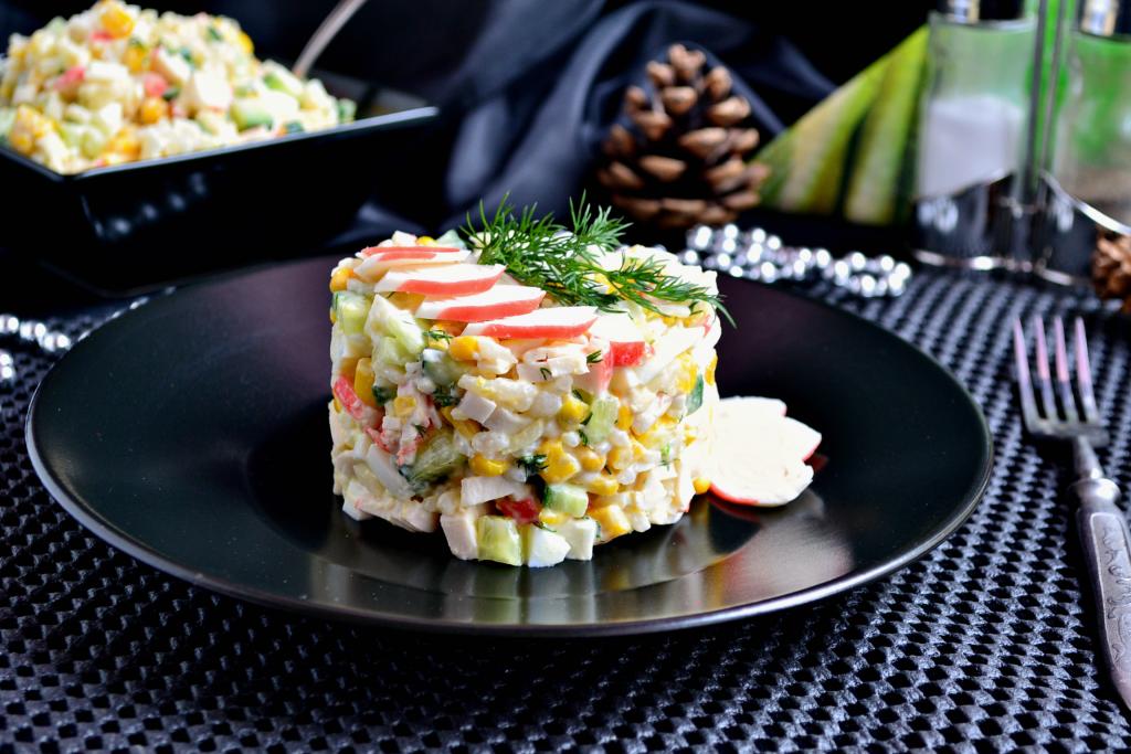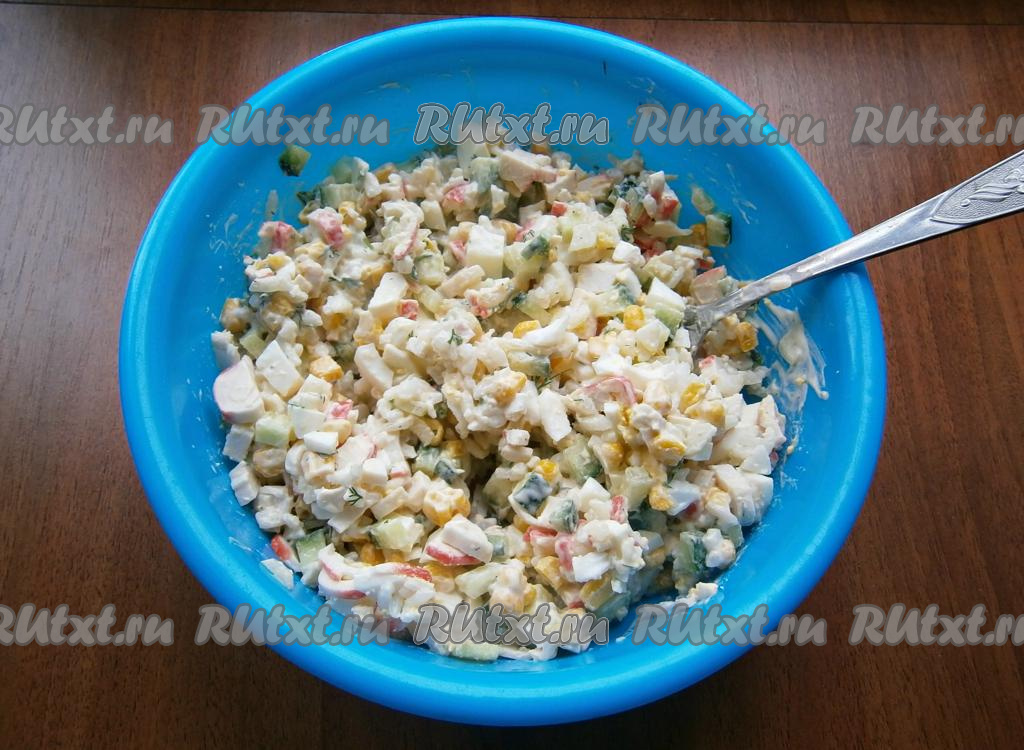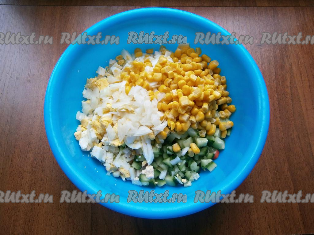 В салат из крабовых палочек, огурца и яиц добавить консервированную кукурузу без жидкости, мелко и тонко нарезанный очищенный репчатый лук.