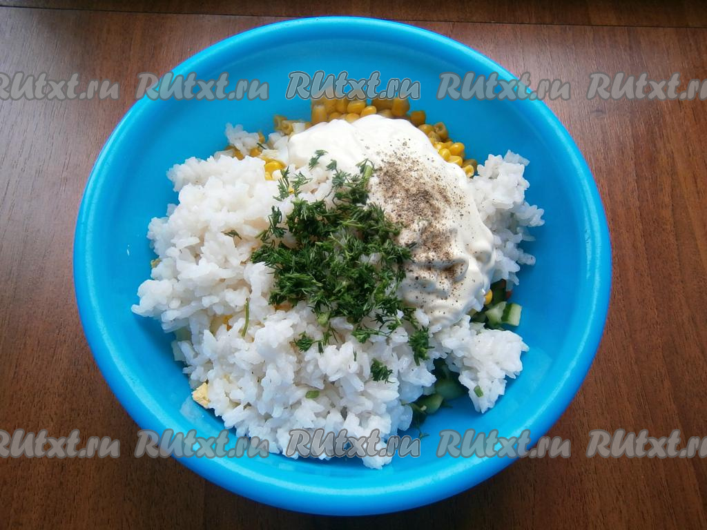 Укроп промыть водой, мелко нарезать. Добавить в салат остывший рис, нарезанный укроп, майонез, соль и чёрный молотый перец.