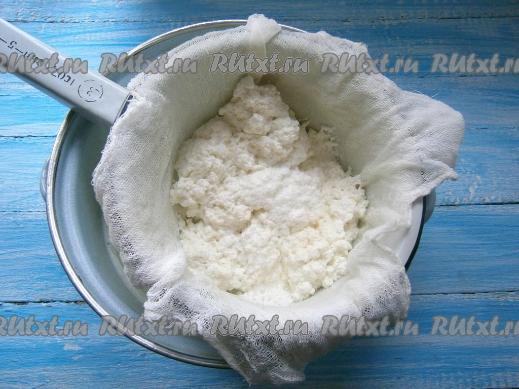 Дуршлаг застелить марлей, сложенной в два слоя, отцедить творог от сыворотки.